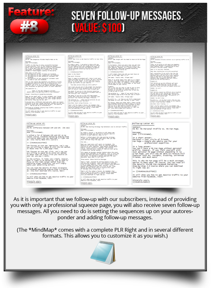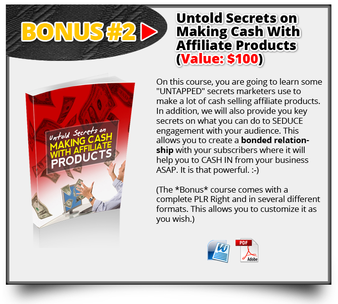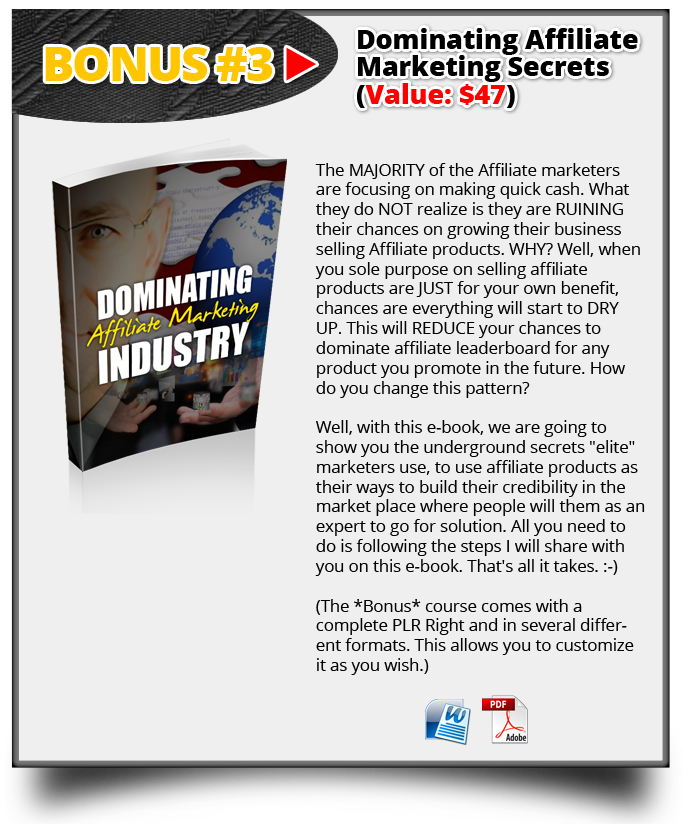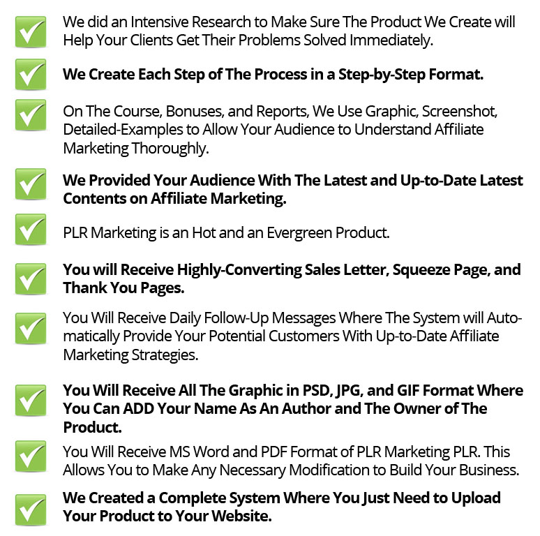 This is NOT just a regular "mickey mouse" Affiliate Marketing PLR products you have seen on the Internet. It is a comprehensive training guide that allows your audience to build their business with Affiliate Marketing. In addition, each part of the course focuses on the MOST basic approach on taking the clients from market research, create squeeze page, thank you page, instant sales domination, follow-up messages, irresistible offer strategies, get massive subscribers, and much more.