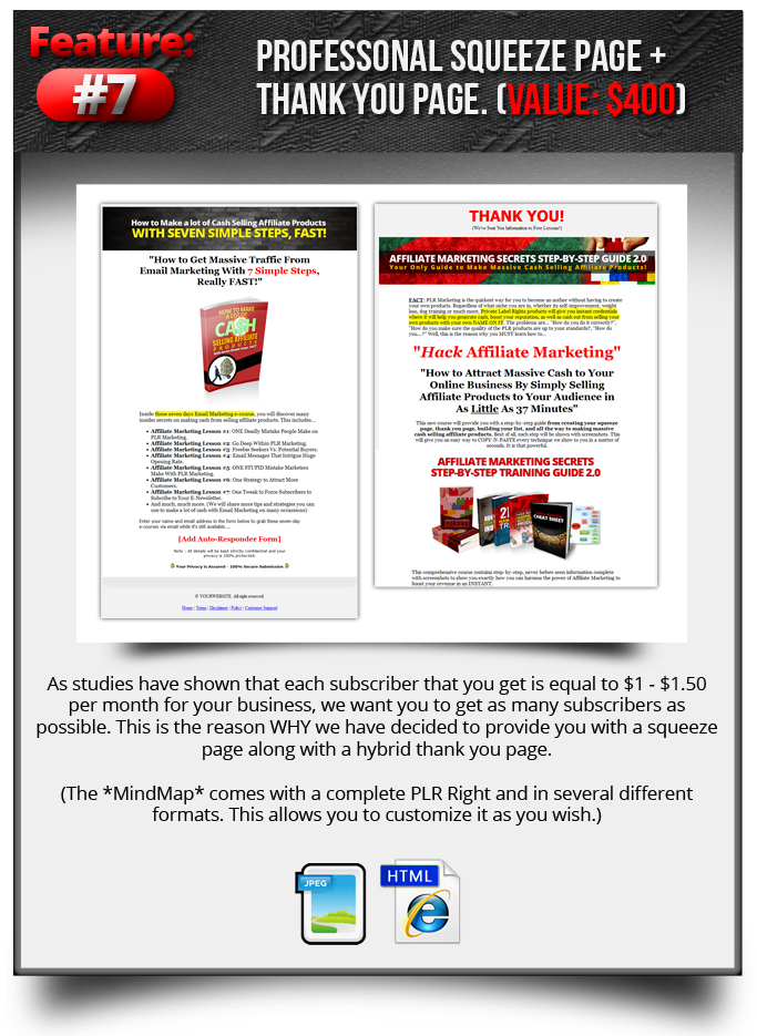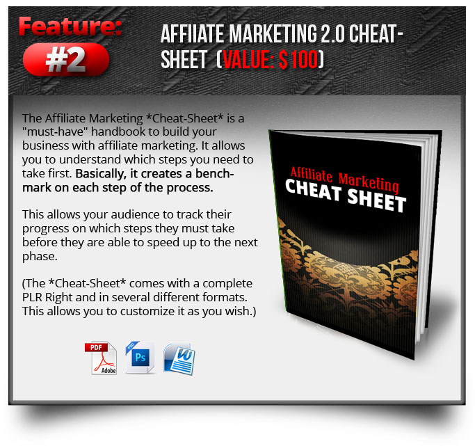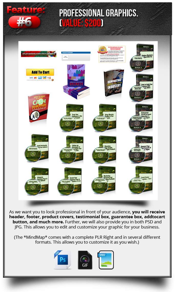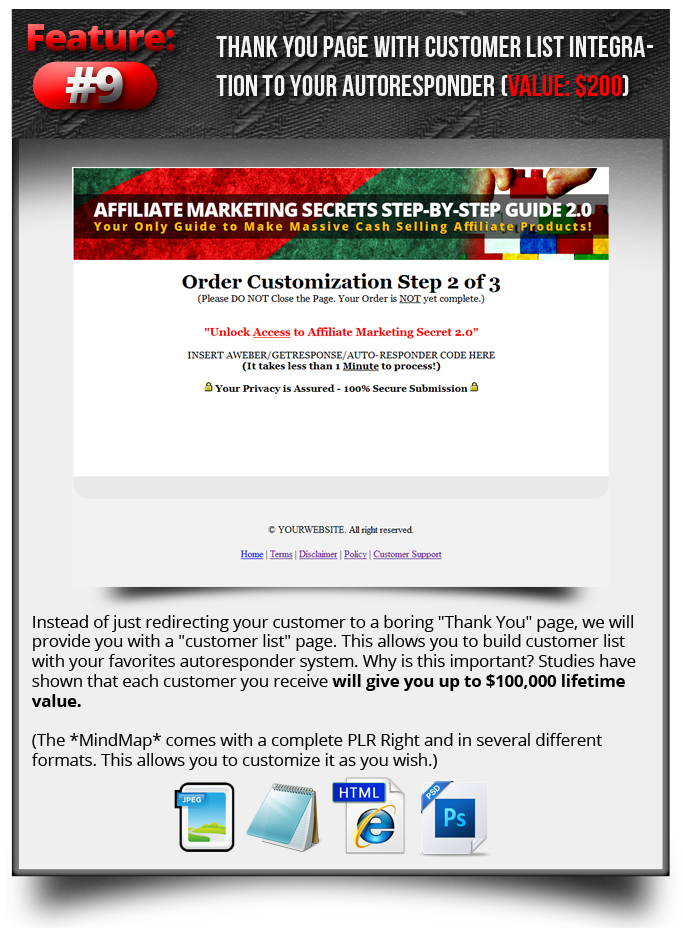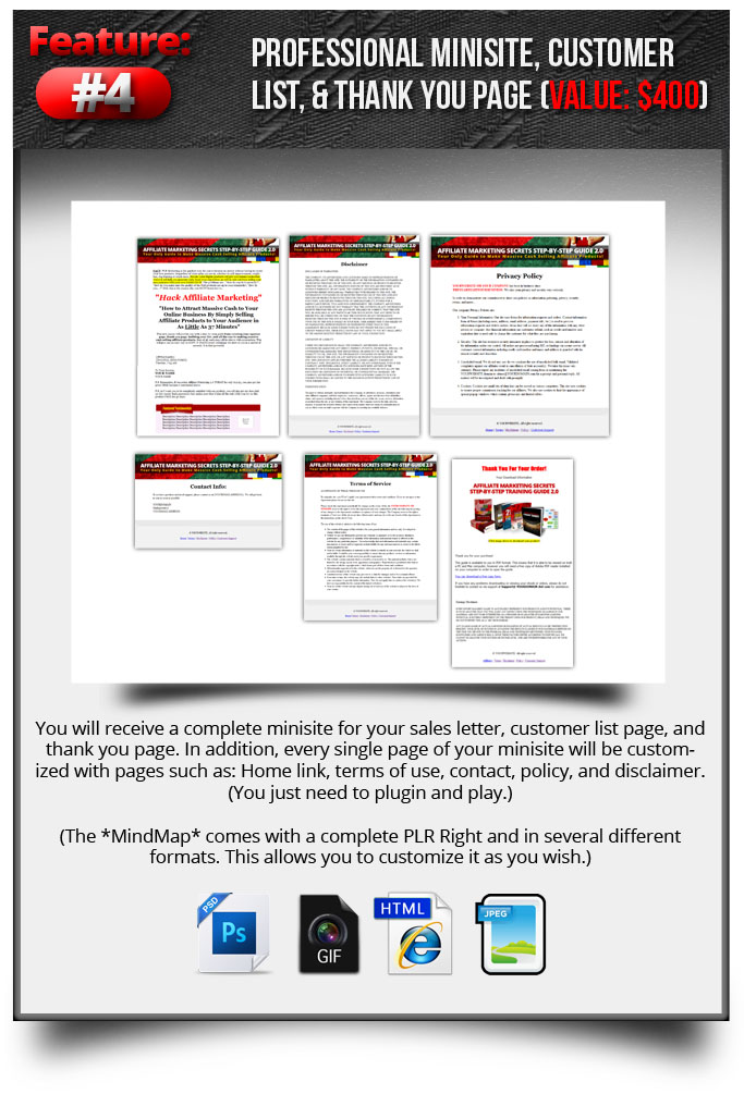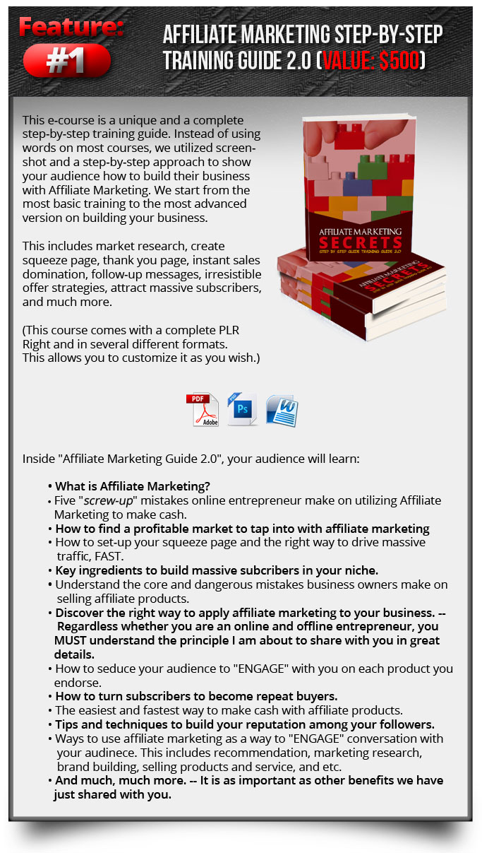 This is NOT just a regular "mickey mouse" Affiliate Marketing PLR products you have seen on the Internet. It is a comprehensive training guide that allows your audience to build their business with Affiliate Marketing. In addition, each part of the course focuses on the MOST basic approach on taking the clients from market research, create squeeze page, thank you page, instant sales domination, follow-up messages, irresistible offer strategies, get massive subscribers, and much more.